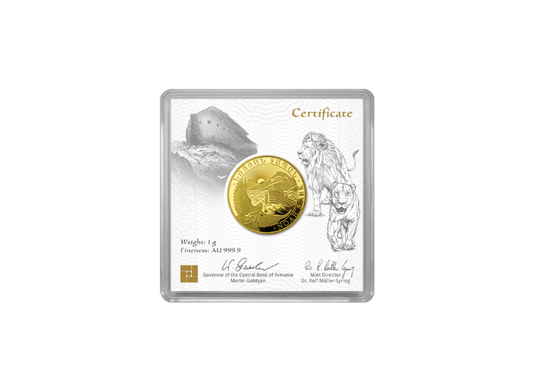 Die Goldmünze Arche Noah 1 g besticht durch 999,9/1000 reinstes Gold und wird von der Zentralbank der Republik Armenien herausgegeben. Die Münze hat einen Nennwert von 100 Dram und ist offizielles Zahlungsmittel in Armenien.