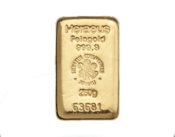 Heraeus Goldbarren werden in verschiedenen handelsüblichen Größen von 1 Gramm bis